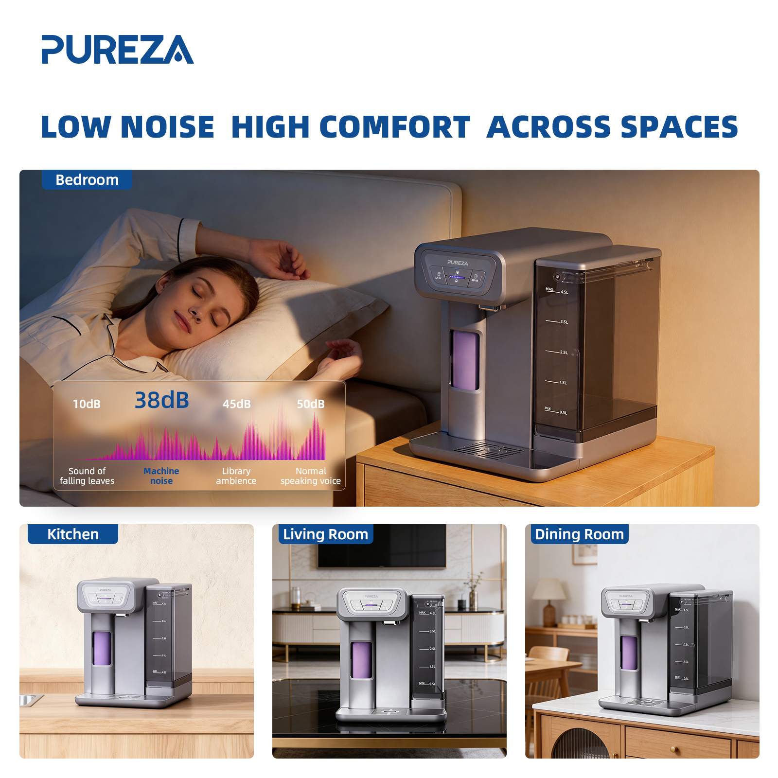 Operating at just 38 dBA, PU-T02 stays impressively quiet—ideal for bedrooms, offices, and open kitchens. Combined with a highly efficient system that consumes only 1 kWh/day, it delivers purified, chilled water with minimal disturbance and long-term energy savings.
